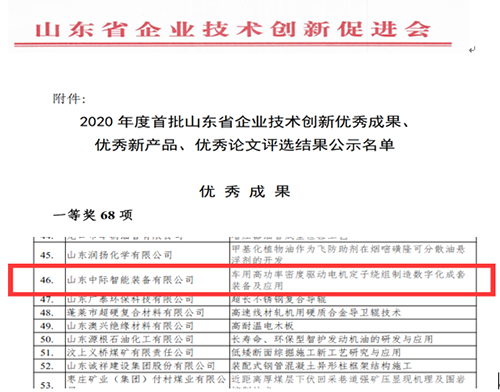 【概要描述】山東中際智能裝備有限公司“車用高功率密度驅(qū)動電機(jī)定子繞組制造數(shù)字化成套裝備及應(yīng)用”項目成功入選優(yōu)秀成果一等獎。據(jù)悉,本次全省獲得一等獎的有68項,中際裝備項目成功入圍,突顯了中際裝備在創(chuàng)新方面的成果得到了認(rèn)可